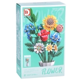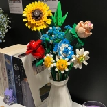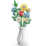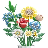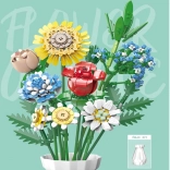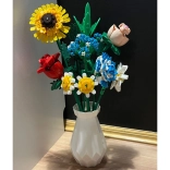 Verwandeln Sie den Bausatz in eine Design-Dekoration. Der farbenfrohe Strauß aus Bauteilen umfasst Sonnenblume, Rosen, Nelke, Gänseblümchen, Lilie, Vergissmeinnicht und grüne Ergänzungen (Haitong-Blätter, Zeder, Gras). Ebenfalls enthalten ist ein eleganter cremefarbener Flakon, sodass Sie den fertigen Strauß sofort auf ein Regal oder einen Tisch stellen können.