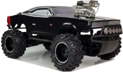 Dieses schwarze RC-Geländewagen vereint den markanten Look eines Muscle Cars mit hoher Offroad-Performance. Die widerstandsfähige Konstruktion dämpft Stöße, und die hochwertige Federung meistert Unebenheiten, während breite Räder mit tiefem Profil für hervorragende Traktion auf Gras, Sand und Kies sorgen.