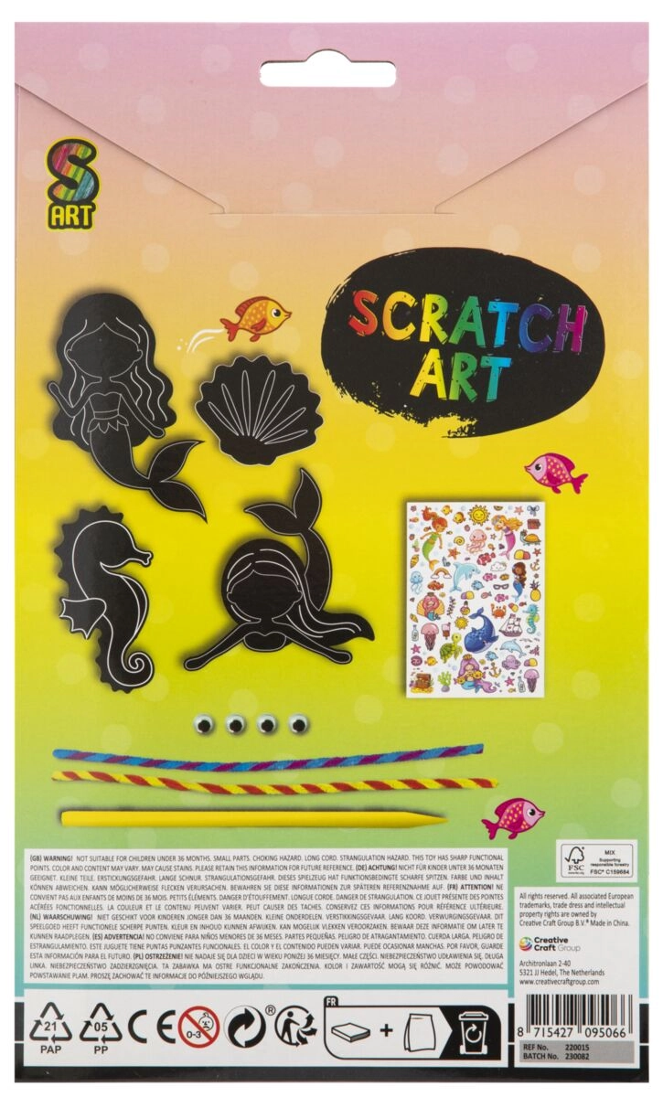 Fördern Sie kindliche Fantasie und Feinmotorik mit einem Kreativset, das die schwarze Oberfläche in farbige Motive verwandelt. Einfach den beiliegenden Kratzstift verwenden und eigene Muster, Linien und Details gestalten. Mit Aufklebern und Dekorationen werden die Tiere noch individueller und lustiger.