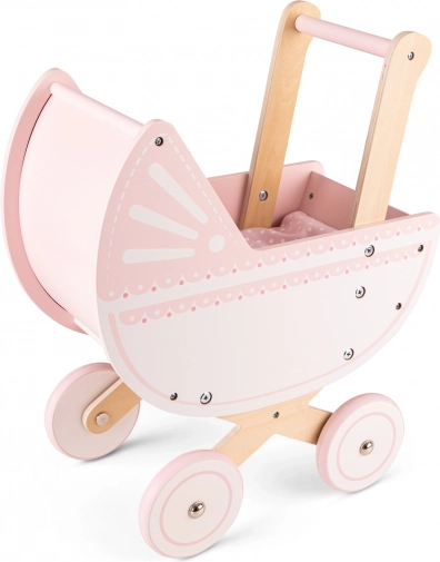 Holzpuppewagen für Puppen in rosa Farbe ist ideal für alle kleinen Betreuerinnen und Betreuer. Er ist mit einer weichen Decke und einem Kissen für maximalen Komfort der Lieblingspuppe oder des Plüschfreundes ausgestattet.