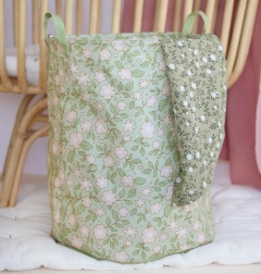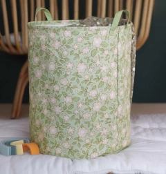 Verschönern Sie Ihr Zuhause mit diesem Korb, der ein wunderschönes Blumenmuster auf salbeigrünem Hintergrund zeigt.