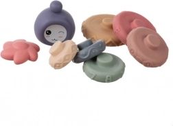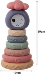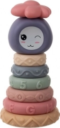 Bauen Sie einen bunten Turm mit einem niedlichen Kätzchen-Köpfchen und einem Blumenhütchen. Sechs pastellfarbene Ringe mit unterschiedlichen Oberflächen laden zum Entdecken, Drücken und Aufstecken ein. Einige Teile quietschen beim Drücken, wodurch das Gehör stimuliert und Ursache–Wirkung vermittelt wird.