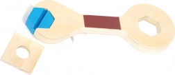 Holzhammer, Schraubendreher, Schraubenschlüssel und Zange sind für kleine Kinderhände entworfen. Sie fördern natürliche Geschicklichkeit und das Nachahmen echter Arbeit.