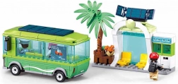 Im Set enthalten sind außerdem eine dekorative Haltestelle und eine Palmenfigur, die dem Spielumfeld ein realistisches Aussehen verleihen.