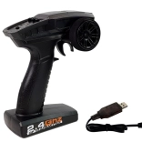 Der ergonomische Sender ermöglicht fein dosierbares Gas und präzises Lenken. Die 2,4-GHz-Frequenz verhindert Störungen, und die Reichweite von bis zu 80 m bietet viel Bewegungsfreiheit. Stromversorgung: 3× AA (nicht enthalten).