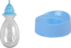 Komplette Ausstattung für die Puppenpflege: transparentes Fläschchen und blaues Töpfchen für Hygiene-Training und lustige Spielszenen.
