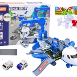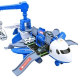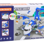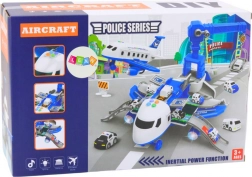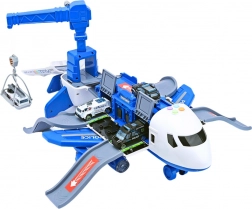 Ausgeklappt verwandelt sich das Flugzeug in eine mobile Polizeistation mit Rampen, Stauraum und einer Plattform zum „Abschießen“ der Autos für den schnellen Einsatz. Enthalten sind 3 Polizeifahrzeuge, ein drehbarer 360°-Kran mit Steuerrad sowie ein Set aus Schildern, Kegeln und weiterem Zubehör zum Bau einer eigenen Stadt und Straßen.