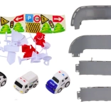 Drei Polizeifahrzeuge, Verkehrsschilder, Kegel und „Straßen“-Teile erweitern die Spielmöglichkeiten und fördern Fantasie sowie Feinmotorik.