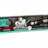 Nach dem Einschalten leuchtet das Schwert mit weißem Licht durch die türkisfarbene Hülle und begleitet das Spiel mit authentischen Weltraumgeräuschen.