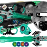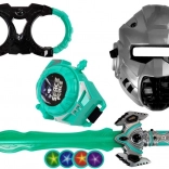 Das Lichtschwert erzeugt Ton- und Lichteffekte wie bei echten Weltraumduellen. Probieren Sie es im Dunkeln aus! Das Set enthält außerdem eine Maske, dank der Ihr kleiner Kämpfer wie ein echter Weltraumkrieger aussieht. Das gesamte Set ist in Schwarz‑Silber‑Türkis gehalten. Ein Scheibenwerfer und Handschellen helfen, den Gegner gefangen zu nehmen.