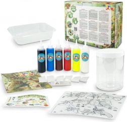 Fertige Insekten können in einem Aquarium mit Wasserkristallen aufbewahrt werden, die ebenfalls im Set enthalten sind. Das Aquarium lässt sich leicht mit den beiliegenden Aufklebern dekorieren. Ein edukatives Poster vermittelt faszinierende Fakten über Insekten.