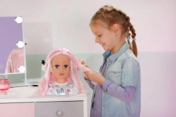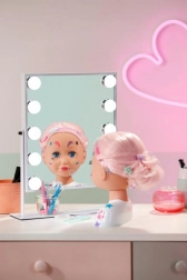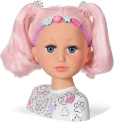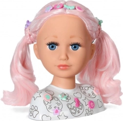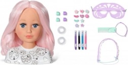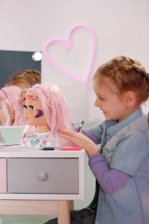 Dieser kreative Frisierkopf ist ideal für kleine Stylistinnen und Visagistinnen. Die langen rosa Haare aus hochwertigem Nylon behalten ihre Form und sind perfekt zum Kämmen, für Zöpfe und Flechtfrisuren. Mit den beiliegenden Stiften und der Schablone lassen sich außerdem ganz einfach originelles Make-up und lustige Motive im Gesicht gestalten.