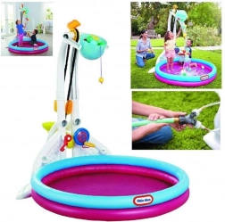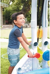 Entdecken Sie das multifunktionale Wasserzentrum, das jeden Garten und jedes Kinderzimmer in einen Ort voller Freude verwandelt. Kinder können den Wasserfluss steuern, den Spritzbehälter füllen, den doppelten Wasserfall auslösen und beobachten, wie die Bälle über das Wasser-/Kugel-Förderband in den oberen Eimer rollen. Die aufblasbare Basis erhöht Sicherheit und Komfort beim Spielen.