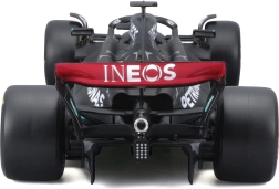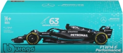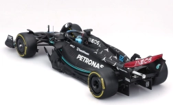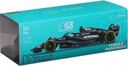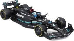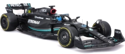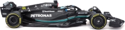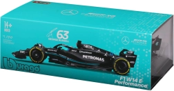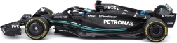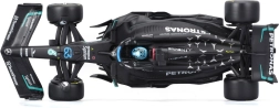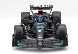 Getreu reproduzierte Formen, Lackierung und Sponsorenlogos des MERCEDES‑AMG PETRONAS F1 W14 (2023) mit der Startnummer 63 für George Russell.