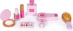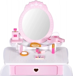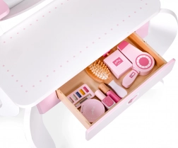 Der Schminktisch ist mit Spielzeug wie einem Föhn, einer Bürste, einer Puderdose mit Applikator, einer Lidschattenpalette, einem Nagellack, einem Lippenstift und einer Parfümflasche ausgestattet. Alle Accessoires sind ohne scharfe Kanten, was sie völlig sicher für Kinder macht.