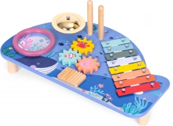 Der Musiktisch ist reich mit Ozeanmotiven verziert und mit bunten Elementen ausgestattet, die sofort die Aufmerksamkeit des Kindes auf sich ziehen.