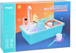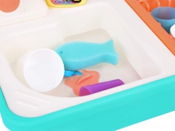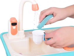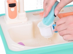 Funktionen: Einfach den Behälter mit 2,2 Litern Wasser füllen, den Wasserhahn drehen und zusehen, wie das Wasser zirkuliert. Die Spüle kann mit dem mitgelieferten Korken verstopft werden, was die Kinder lehrt, Wasser zu sparen und die Umwelt zu schützen. Der Wasserhahn wird mit 2 AA-Batterien betrieben (nicht im Lieferumfang enthalten).