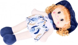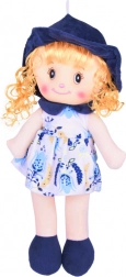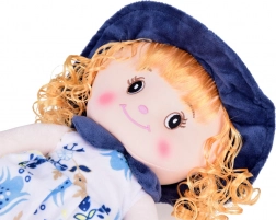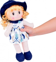 Diese Puppe ist vollständig aus weichem, angenehm anzufassendem Material hergestellt. Sie trägt ein plissiertes Kleid mit Blumenmuster, das farblich auf Schuhe, Kragen und Hut abgestimmt ist. Ihr Haar ist lockig und blond. Augen, Augenbrauen, Lächeln und Nase sind gestickt, was sie komplett frei von kleinen Teilen macht, die beim Spielen abfallen könnten.