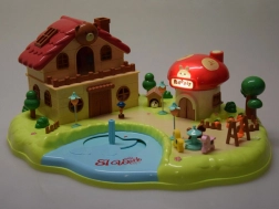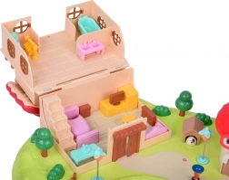 Schlafzimmer mit aufklappbarem Kleiderschrank, Badezimmer mit Badewanne und Waschmaschine, Küche mit Kühlschrank und ein Zimmer mit Schminktisch. Draußen warten ein Spielplatz mit Karussell und Schaukel sowie ein Laden in Pilzform.
