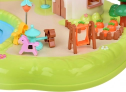 Das mehrstöckige Innere ist reich ausgestattet: Im Erdgeschoss finden Sie ein Schlafzimmer mit bequemem Bett und aufklappbarem Kleiderschrank, zudem fehlen Sofa, TV und Kommode nicht; im Obergeschoss gibt es ein Badezimmer mit Badewanne, Waschbecken und Waschmaschine; die nächste Ebene bietet eine Küche mit Kühlschrank sowie ein Zimmer mit Schminktisch. Im Garten warten Karussell und Schaukel für noch mehr Spaß.