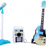 Gitarre, Mikrofon am Stativ und Verstärker in einem Paket – bereit für die ersten Wohnzimmerkonzerte und Karaoke.