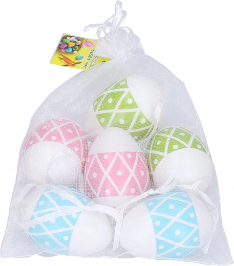 Verschönern Sie Ihr Zuhause mit diesem Set aus dekorativen Plastikeiern in verschiedenen Farben. Perfekt für Frühlings- und Osterdekorationen. Das Set enthält sechs Eier, geliefert in einem eleganten Organzabeutel.