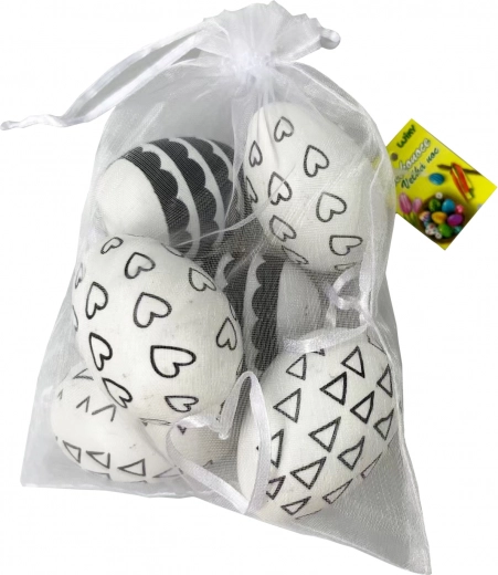 Schwarz-weiße dekorative Plastikeier sind die perfekte Wahl für diejenigen, die ein modernes und einfallsreiches Accessoire für ihr Zuhause suchen. Die Eier sind aus strapazierfähigem Kunststoff gefertigt und werden in einem eleganten Organzabeutel mit 6 Stück geliefert.