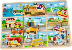 Dieses farbenfrohe Holzpuzzle bringt Kindern die Freude am Entdecken verschiedener Verkehrsmittel. Enthalten sind Schulbus, Polizeiauto, Krankenwagen und weitere Fahrzeuge, die einfach in die entsprechenden Öffnungen eingesetzt werden können.