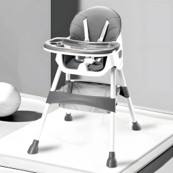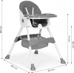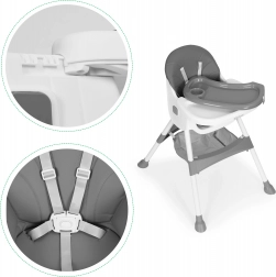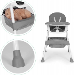 Für Sicherheit sorgen der 5-Punkt-Gurt und die stabilen Metallbeine mit rutschfesten Endkappen. Das abnehmbare zweilagige Tablett hat erhöhte Ränder und einen Becherhalter, die obere Ebene ist spülmaschinengeeignet. Die klappbare Konstruktion spart Platz und der Korb unter dem Sitz hält Lätzchen, Tücher und Spielzeug stets in Reichweite.