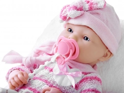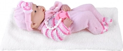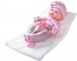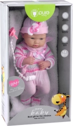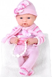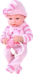 Ein detailliertes Gesicht, zarte Züge und ein rosafarbener Strickanzug mit Mützchen verleihen der Puppe ein natürliches und sanftes Erscheinungsbild, das Kinder zum Kuscheln und Pflegen einlädt.