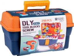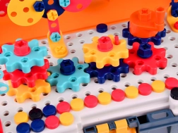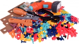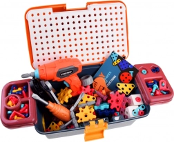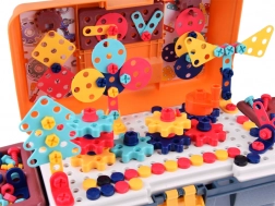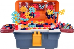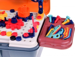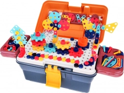 Dieses umfangreiche Set für kleine Meister verwandelt jedes Zimmer in eine kreative Werkstatt. Der verschließbare Koffer dient als praktische Aufbewahrung und Arbeitsfläche – die perforierte Platte ermöglicht das feste Befestigen von Schrauben, Muttern und Bauteilen, mit denen Kinder Autos, Hubschrauber, Tiere und bewegliche Konstruktionen mit Zahnrädern leicht zusammensetzen.