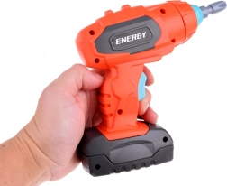 Die batteriebetriebene Kinderbohrmaschine/der Schraubendreher, Schraubendreher, Schlüssel und Zangen unterstützen das realistische Rollenspiel als Handwerker, während die bunten Teile Kinder an Formen, Muster und die Prinzipien einfacher Mechanik heranführen. Enthalten ist auch ein Inspirationsheft mit Bauideen.