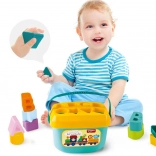 Der gelbe Deckel mit Aussparungen führt Kinder zum Zuordnen der richtigen Formen. Er fördert logisches Denken und präzise Bewegungen.