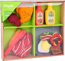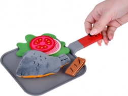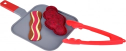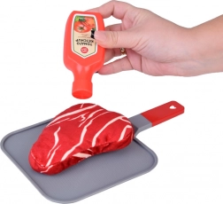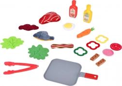 Im Set enthalten sind praktische Accessoires – Pfanne und Zange – sowie eine bunte Auswahl an Lebensmitteln: Steak, Fisch, Hähnchenfilet und -streifen, Ei, Speck, Tomaten- und Zwiebelscheiben, Salatblätter, Karotte, Paprika und zwei Saucen (Ketchup und universelles Dressing). So können Kinder unzählige „Rezepte“ zubereiten und Kochrollen trainieren.