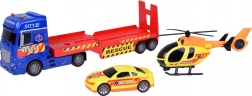 Der Lkw ist mit einer klappbaren Rampe ausgestattet, um den Hubschrauber und das Auto einfach zu transportieren.