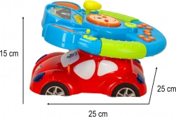 Das Lenkrad ist an einem roten Auto mit Saugnäpfen auf der Unterseite befestigt, was eine feste Befestigung auf verschiedenen Oberflächen ermöglicht. Ideal für den Hausgebrauch und unterwegs.