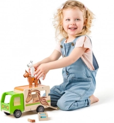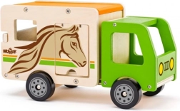 Dieser sorgfältig gefertigte Pferdetransporter aus Holz bietet Kindern realistischen Spielspaß. Die grüne Kabine, die natürliche Holzoptik und der Pferdedruck ergeben ein attraktives Design, das zu Geschichten vom Bauernhof und von der Rennbahn einlädt. Die klappbare Rampe erleichtert das Verladen der Pferde, und die robuste Konstruktion hält täglichem Spiel stand.