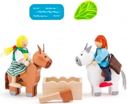 Das Set enthält zwei Figuren, zwei Pferde und eine Holzkiste mit Gemüse, sodass Kinder sofort mit eigenen Szenen beginnen können. Das Spiel fördert Fantasie, Hand-Auge-Koordination und Feinmotorik.