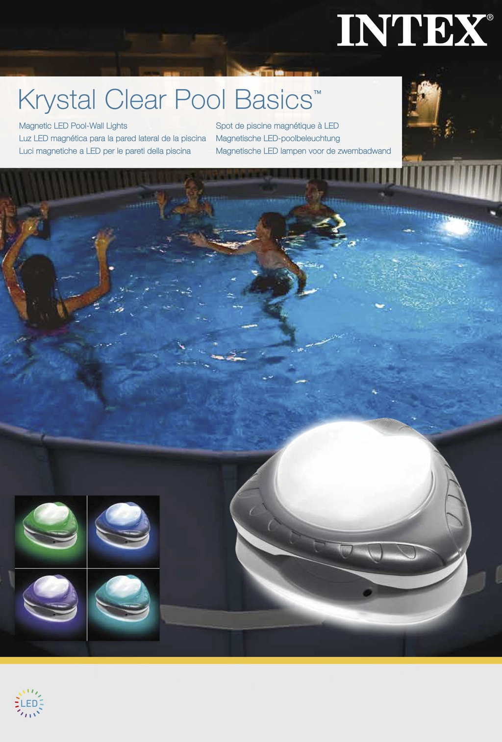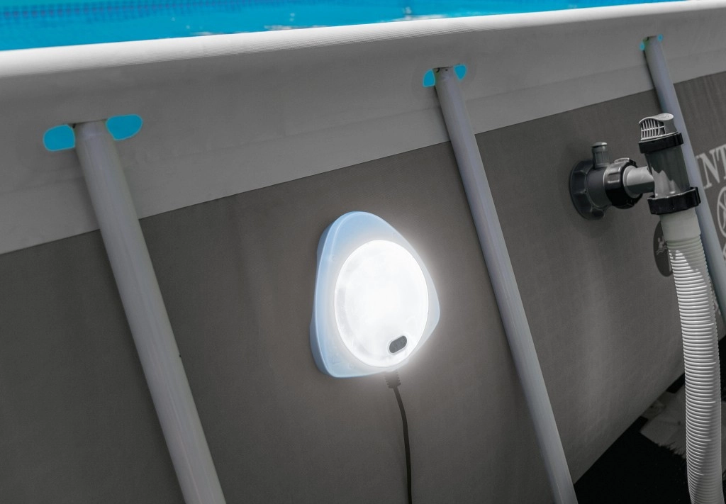 Die magnetische LED-Lampe von INTEX ist eine clevere und sichere Lösung für nächtliches Baden und Gartenpartys. Zwei verbundene Teile haften mit starken Magneten auf beiden Seiten der Poolwand – der Innenteil beleuchtet das Wasser, der Außenteil sorgt für angenehmes Ambientelicht in der Umgebung. Dank der induktiven Stromversorgung ist ein gefährlicher Kontakt von Elektrizität mit Wasser ausgeschlossen.