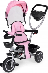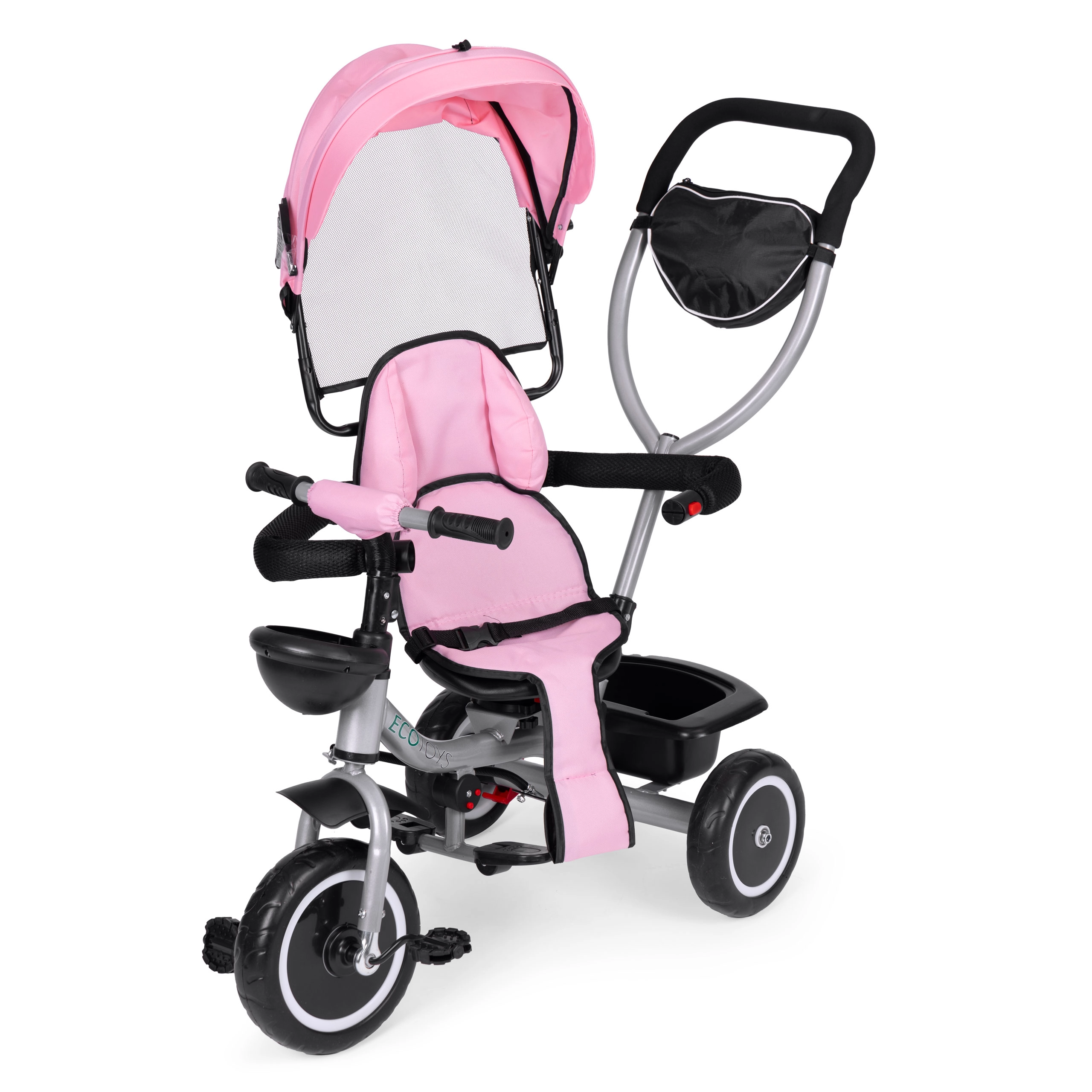 Je nach Alter lassen sich Elemente (Verdeck, Bügel, Schiebebügel) leicht abnehmen und das Dreirad an die Fähigkeiten des Kindes anpassen. Praktische Körbe und eine Tasche mit Reißverschluss bieten Platz für Spielzeug, Flasche und Kleinigkeiten für unterwegs.