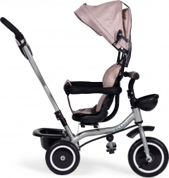 Zur praktischen Ausstattung gehören ein hinterer Korb, ein vorderes Körbchen für ein Spielzeug und eine Reißverschlusstasche für Telefon oder Schlüssel. Durch das schrittweise Abnehmen von Verdeck, Bügel und Schieber passt sich das Dreirad den wachsenden Fähigkeiten des Kindes an – bis hin zur selbstständigen Fahrt.