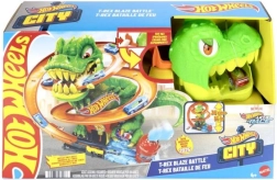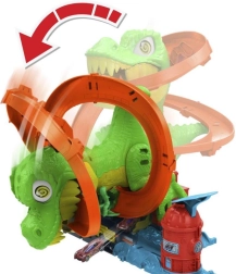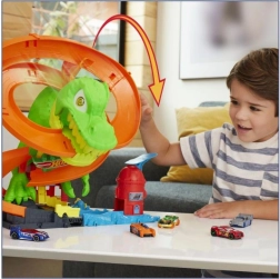 Mach dich bereit für eine spannende Fahrt in Hot Wheels City! Starte das beiliegende Metallauto 1:64 und rase am T‑Rex vorbei. Jedes Mal, wenn das Auto durchfährt, drehen sich die Augen des Dinosauriers, bis er schließlich besiegt ist. Kinder können verschiedene Szenarien ausprobieren – vom schnellen Tanken bis zum heldenhaften Sieg, der die ganze Stadt rettet.