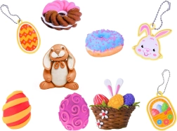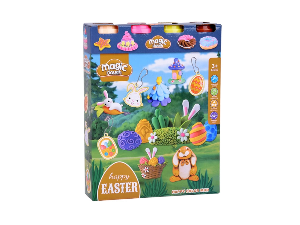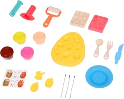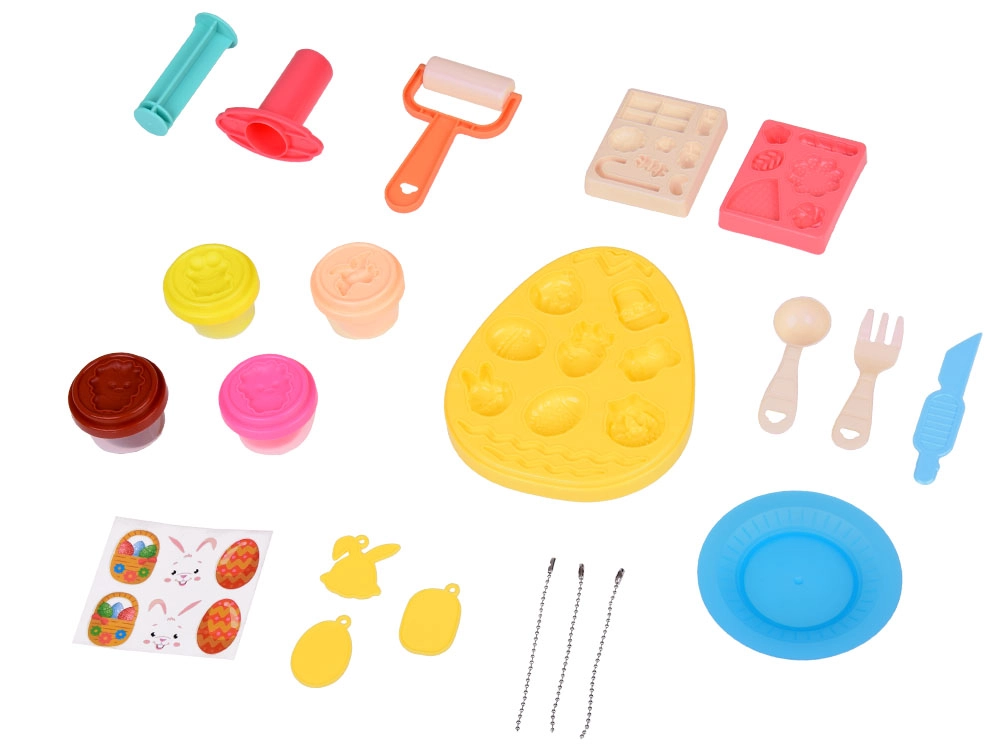 Nicht fehlen dürfen praktische Hilfsmittel für realistisches Back- und Tischspiel: Teigrolle, Tellerchen, Messer, Gabel und Löffel. Ein manueller Ausdrücker formt aus der Knete lustige Sternchenmotive. Kinder können ihre Werke mit Aufklebern verzieren und an 3 beidseitige Anhänger (Hasenkopf, Körbchen, Ei) befestigen – ideal als liebevolle Geschenke.