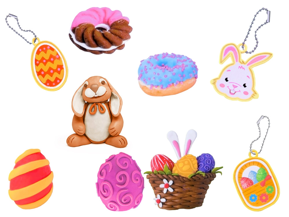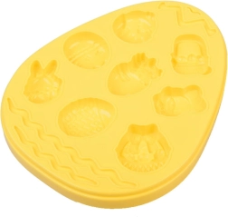 Das große Ei mit Motiven wie Häschen, Körbchen oder Eiern und zwei weitere Formen mit Blättern und Blüten ermöglichen Kindern, vielfältige Knetdekorationen herzustellen.