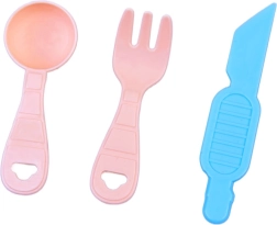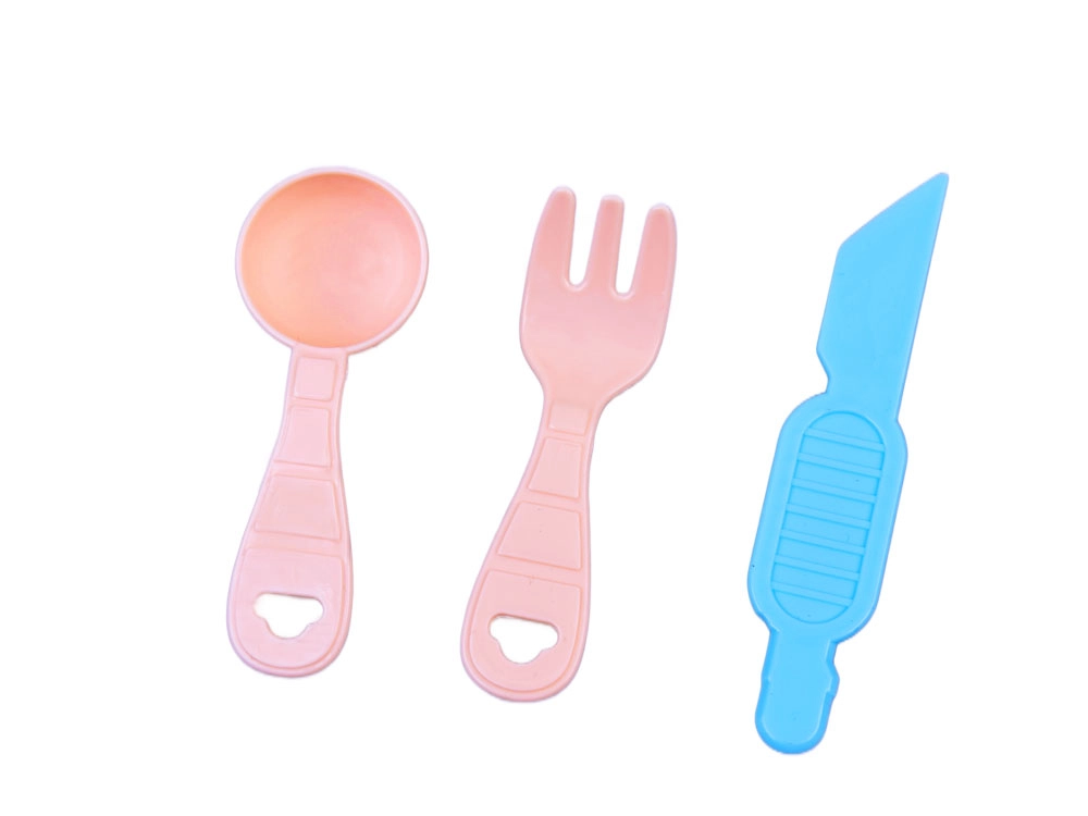 Teigrolle, Tellerchen, Messer, Gabel und Löffel unterstützen das Kochspiel sowie das einfache Formen und Servieren fertiger Kreationen.