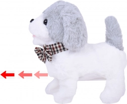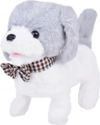 Der weiß‑graue Hund mit kariertem Schleifchen ist aus außergewöhnlich weichem Material gefertigt, das sich ideal zum Kuscheln und für das tägliche Spielen eignet.
