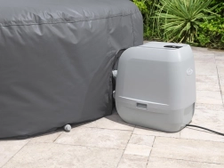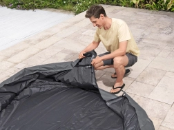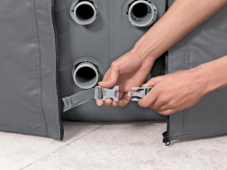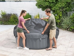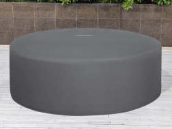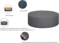 Die Montage ist schnell und intuitiv. Ein verstellbarer umlaufender Gurt mit Sicherungsclips sorgt für festen Halt, während der integrierte Reißverschluss einen problemlosen Anschluss an die Pumpe ermöglicht, ohne die Abdeckung abnehmen zu müssen. Die Abdeckung ist kompatibel mit den Modellen Lay‑Z‑Spa St. Moritz, Monaco, Santorini HydroJet Pro sowie weiteren runden Whirlpools mit 216 cm Durchmesser.