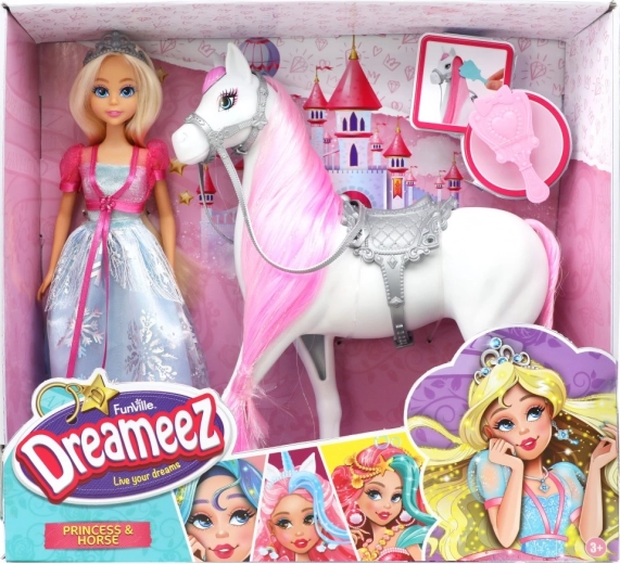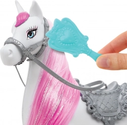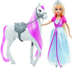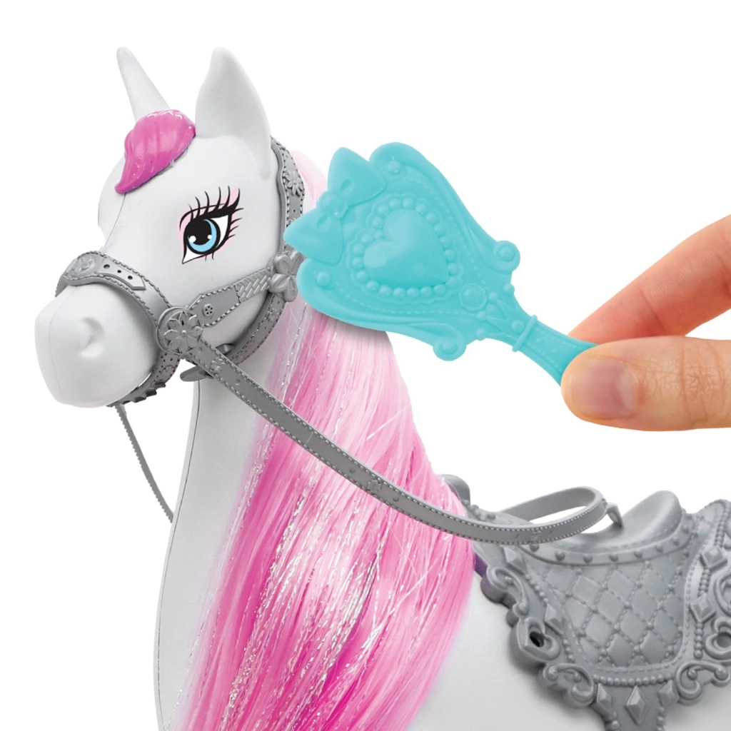 Die Puppe ist ca. 29 cm groß, trägt eine Krone und ein detailverziertes Kleid; das Pferd ist mit Sattel und Zaumzeug ausgestattet. Dank des Zubehörs wird das Spiel noch realistischer und unterhaltsamer – von Ausritten bis zur Pflege der Mähne.