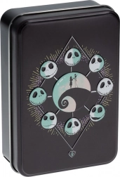 Die schwarze Metalldose mit dem Motiv von Jack Skellington und Sally ist ideal zur Aufbewahrung und hält Ihre Karten sicher.
