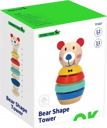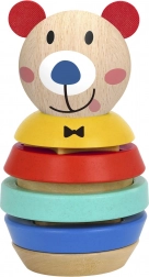 Die Holzpyramide mit Bär vereint Spiel und Lernen. Bunte Ringe, Sterne und weitere Formen werden auf die Stange und an die richtigen Positionen gesteckt, was logisches Denken und räumliche Vorstellungskraft fördert. Kinder üben spielerisch das Sortieren nach Form, Farbe und Größe.